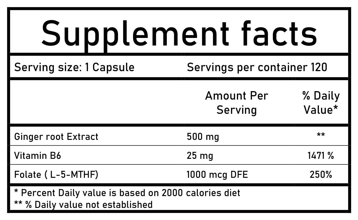 A unique blend of Ginger Extract, Vitamin B6, and L-5-MTHF folate designed to support digestive comfort, energy metabolism, and healthy cell function. Ideal for daily wellness and folate support.