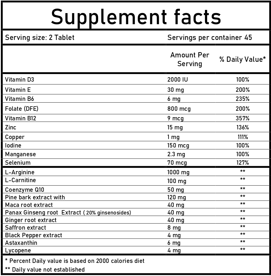 This complex is an advanced formula designed to support the dynamic energy demands and metabolic health of active men. It combines essential nutrients with potent amino acids, antioxidants, and traditional botanicals. Key ingredients like L-Arginine (1,000 mg) and Coenzyme Q10 (CoQ10) (50 mg) support cellular energy production and metabolic function. The formula also features high-potency B-Vitamins, a potent antioxidant profile (including Astaxanthin, Lycopene, and Selenium), and vitality botanicals like Panax Ginseng and Maca Root. BioPerine® is included for enhanced absorption.